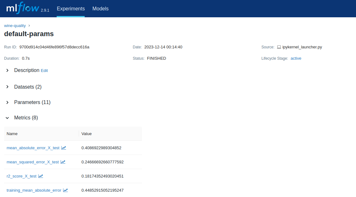Please open the experient named "wine-quality" on the left, then click the run named "default-params" in the table.